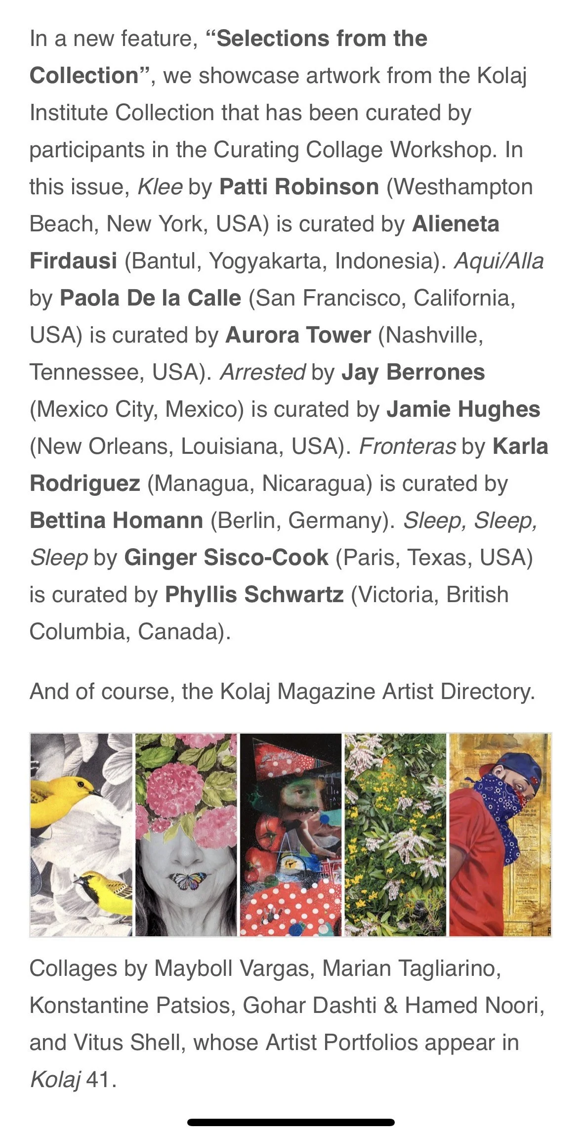 En 2009 descubrió el collage y estudió técnicas contemporáneas en la Accademia D’Arte ADA con Sonia de Franceschi en Florencia, Italia. Su primera obra en esta técnica, con materiales reciclados, fue seleccionada en una Bienal de pintura en ese mismo año. En 2015 ingresó a un taller con Nuria Balcells en Barcelona donde perfeccionó su estilo con elementos cotidianos.